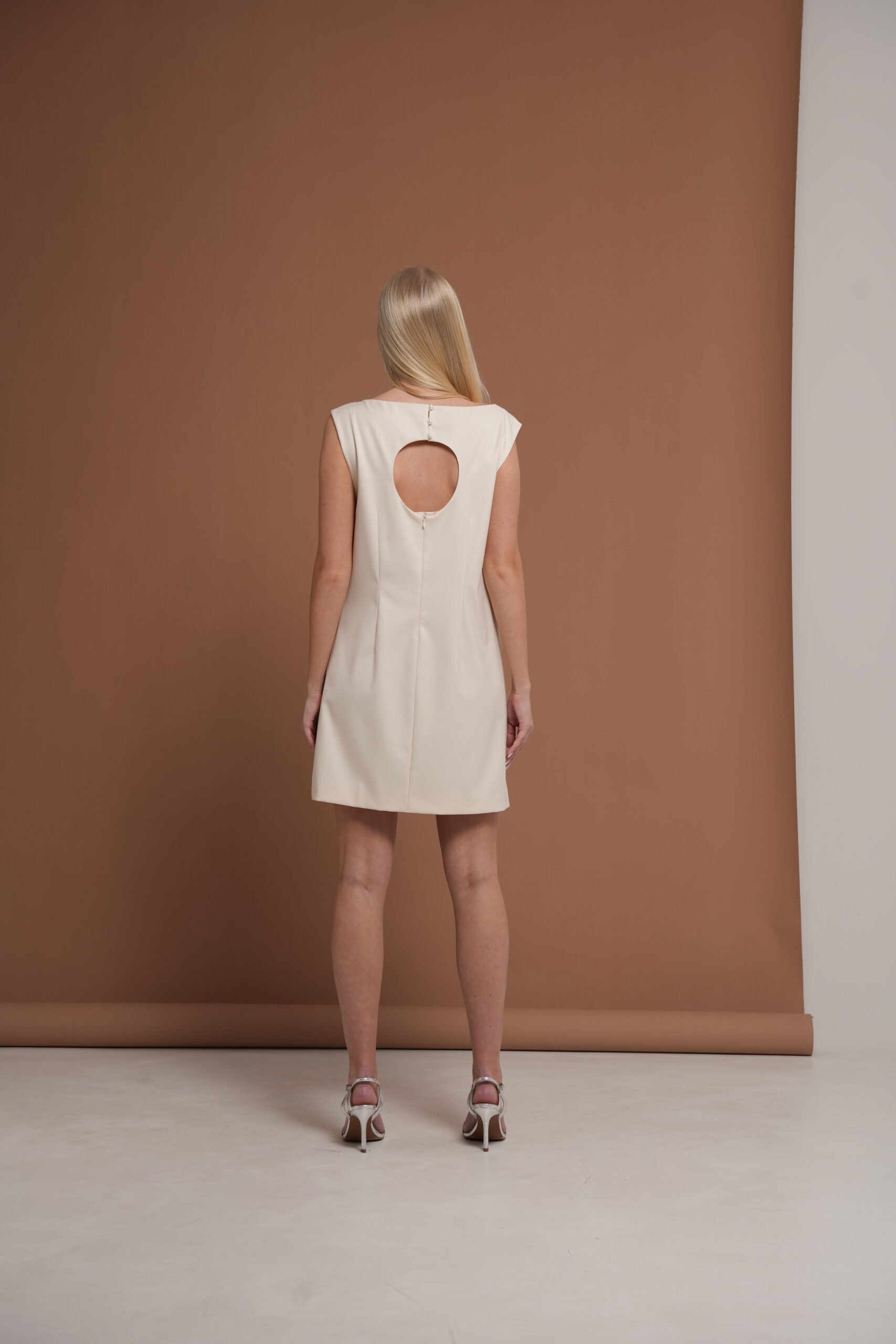• A-line dress with a comfortable fit. Bateau neckline, sleeveless. The back features a zipper and a decorative O-shaped cutout adorned with beads. The dress is lined.