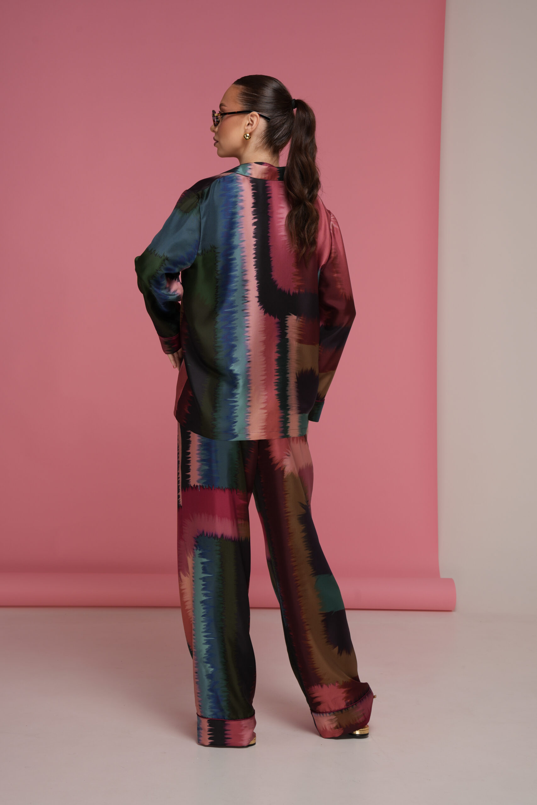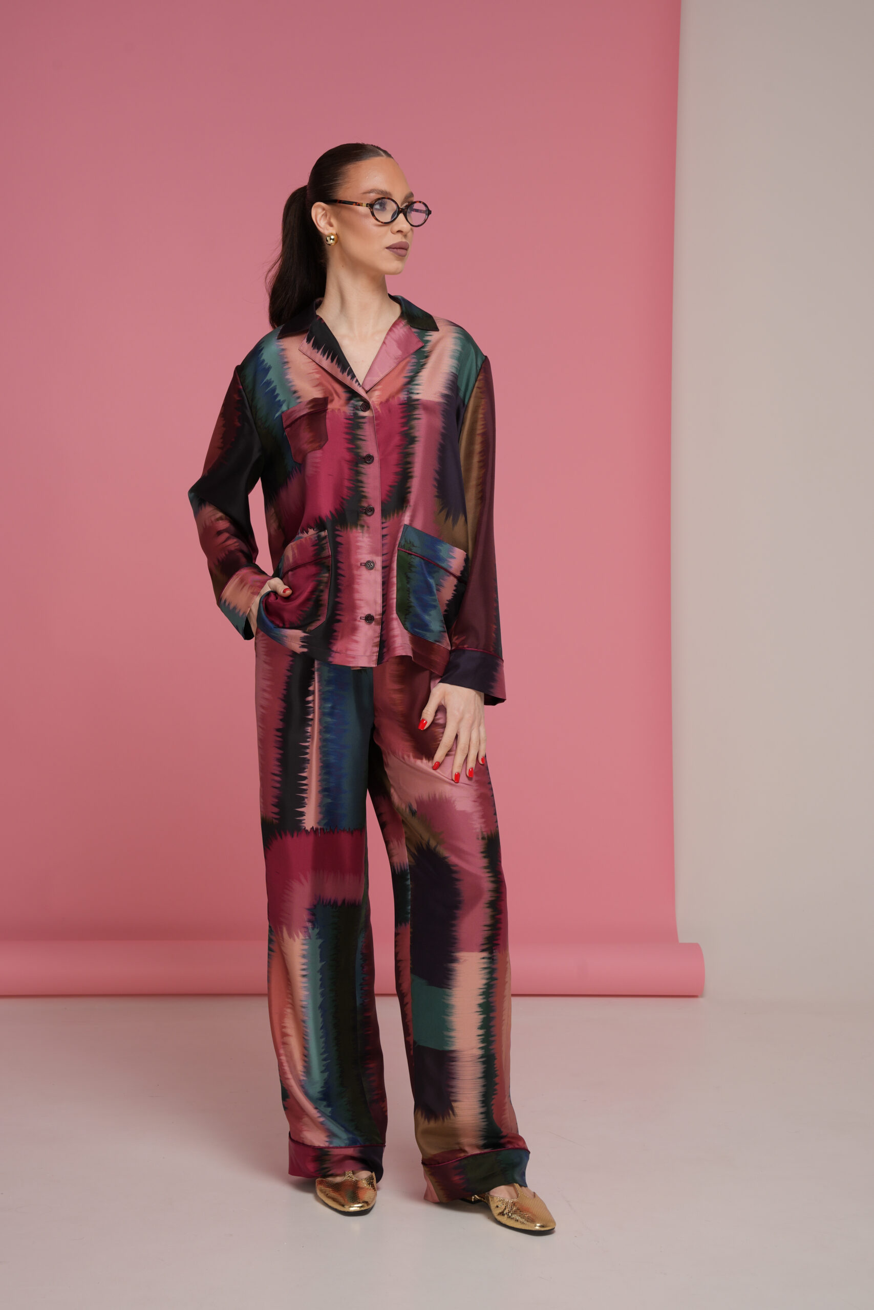 •A chic and contemporary oversized shirt crafted from soft twill silk with a subtle sheen. The geometric print features a sophisticated gradient from marsala to deep navy, creating a modern, eye-catching look.