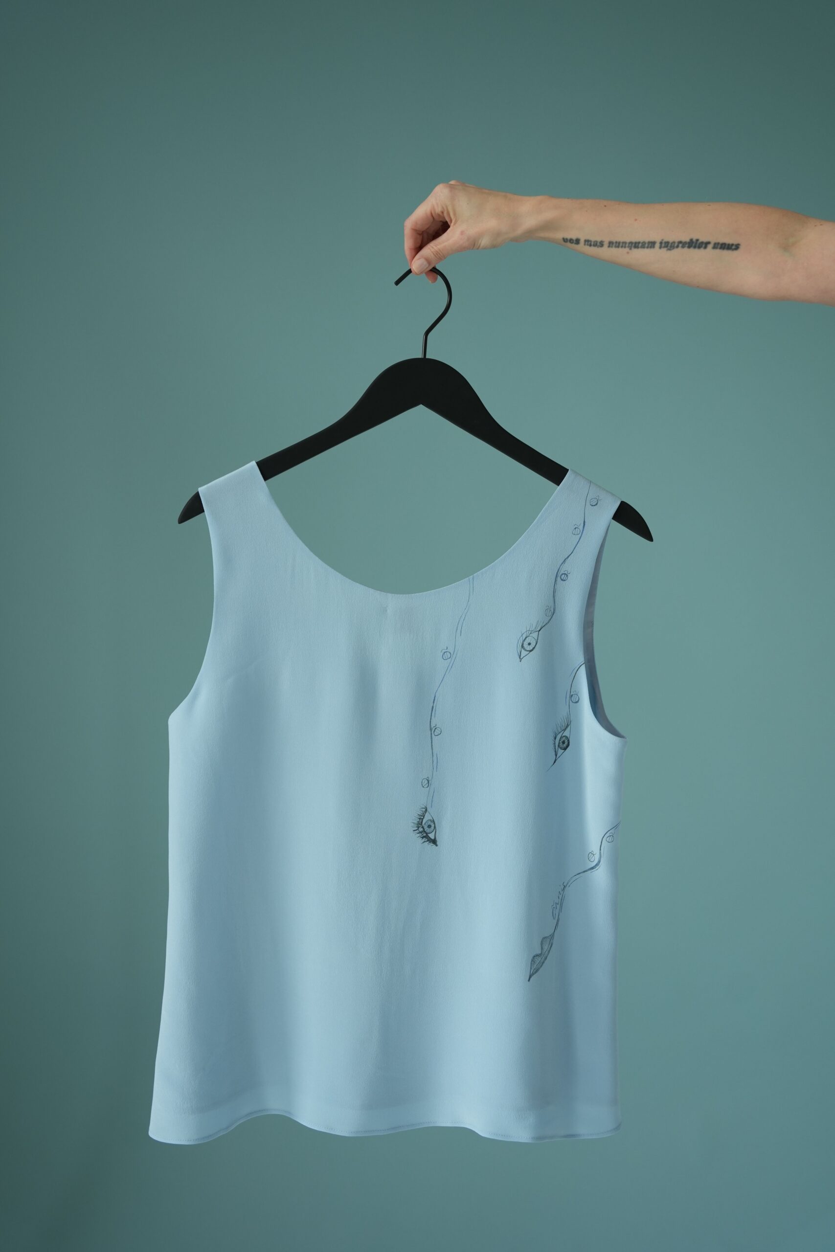 Delicate 100% silk top with lining. Loose fit with a round neckline. Adorned with zonal hand-painted details, making each piece unique.