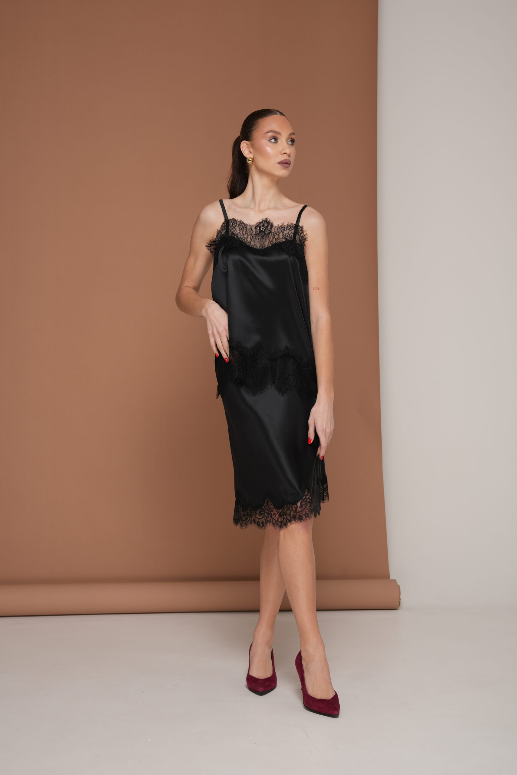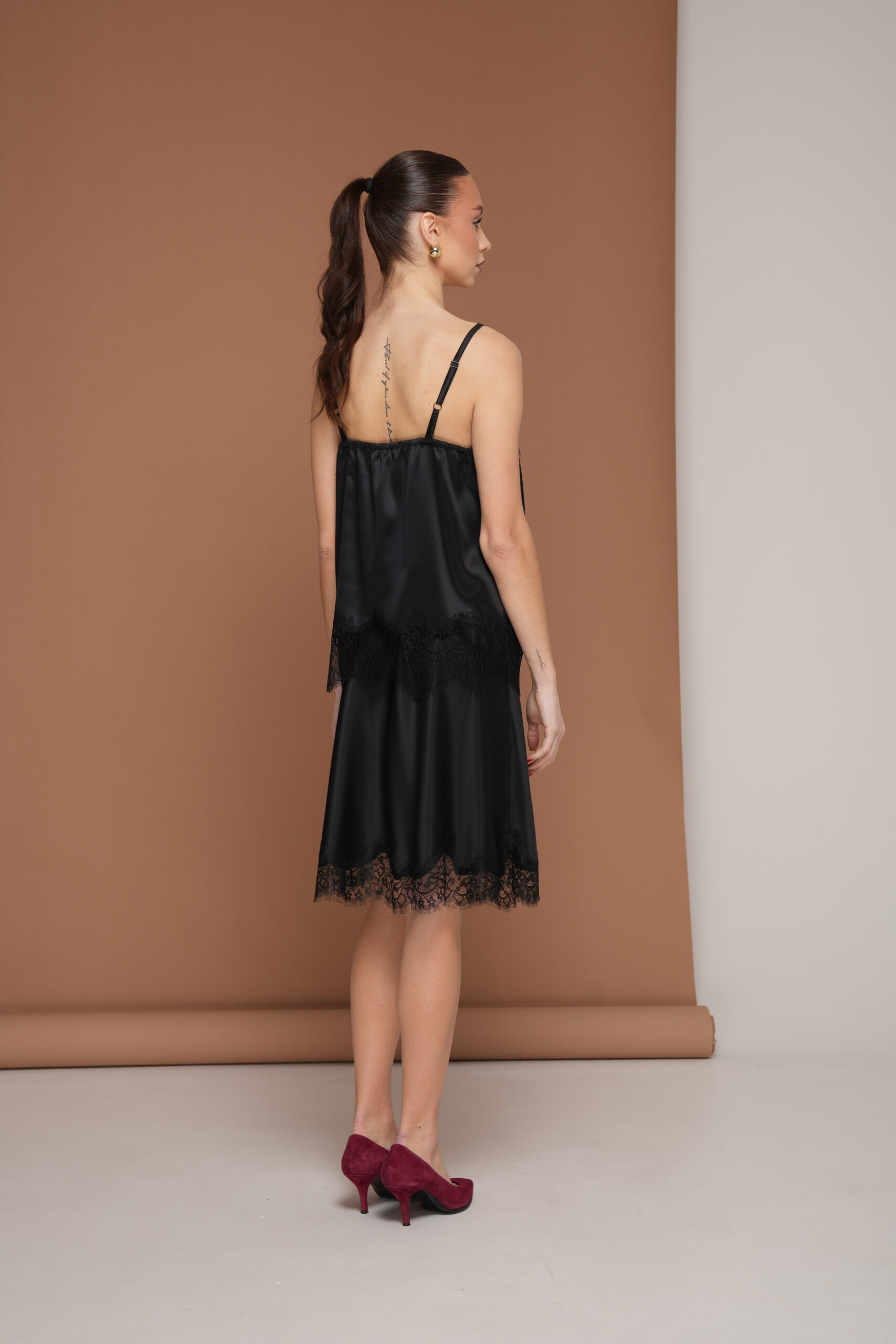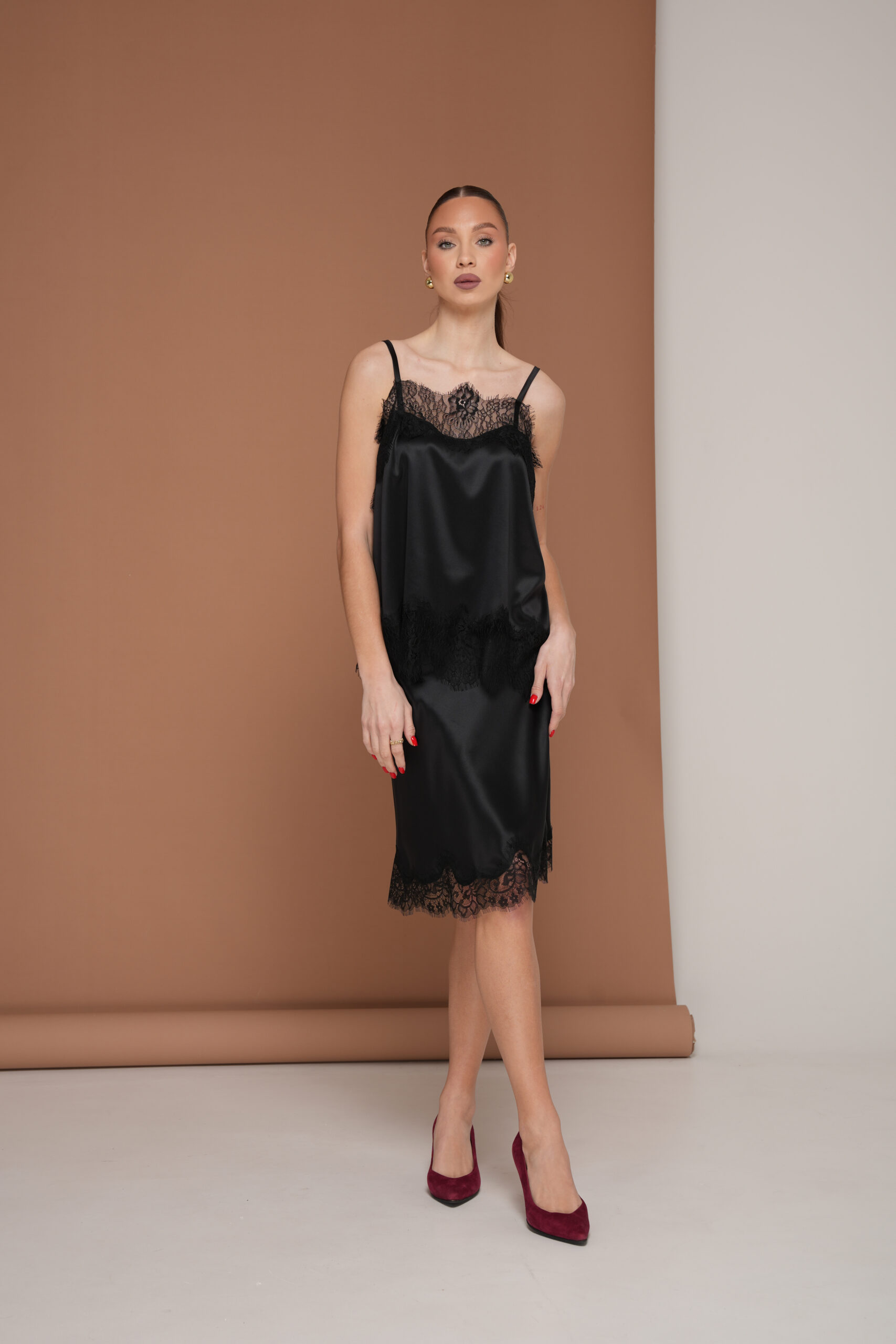 An elegant silk camisole featuring delicate lace detailing along the hem. The lightweight silk drapes beautifully, creating a refined and feminine silhouette. Thin adjustable straps and a V-neckline highlight the shoulders and décolletage.