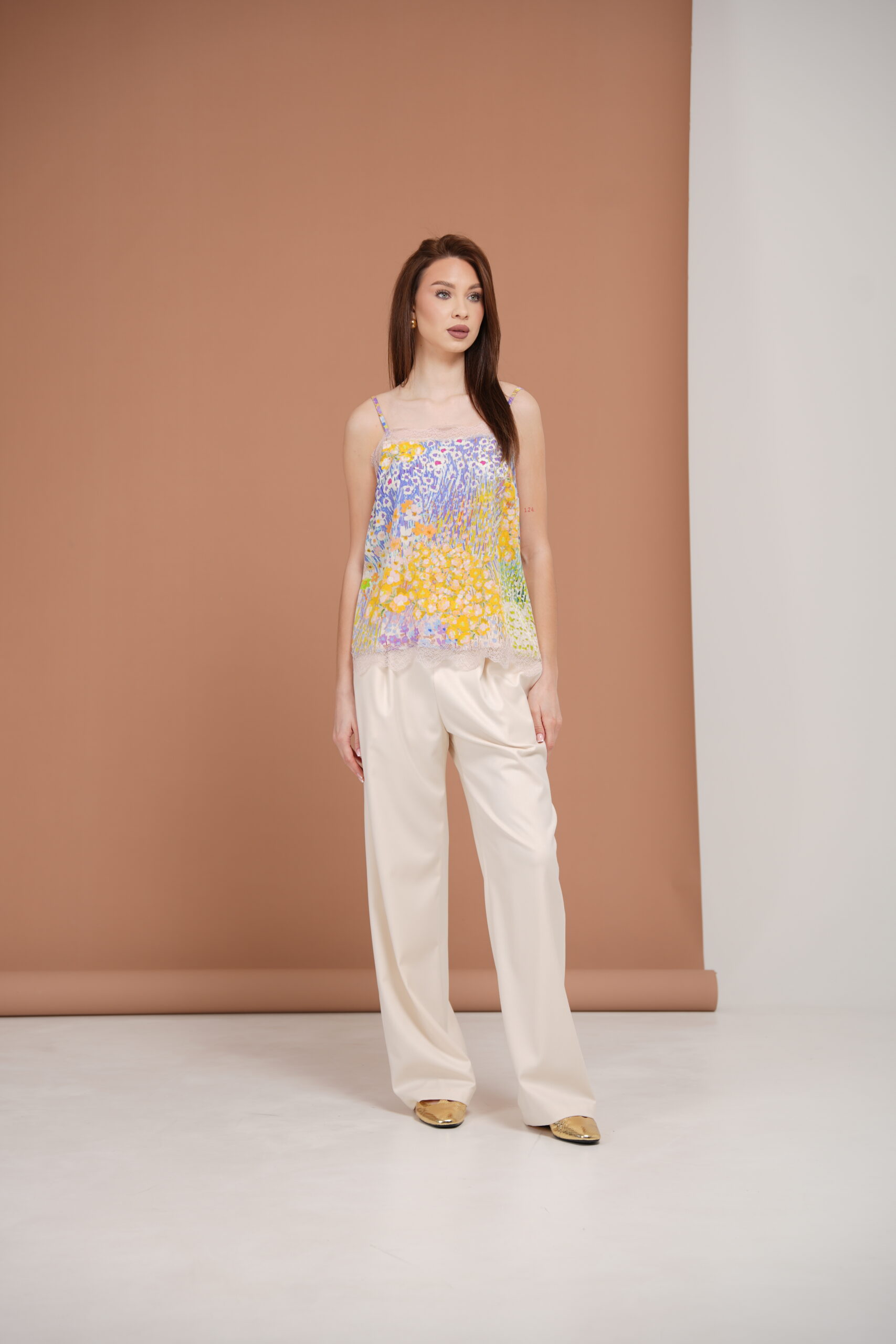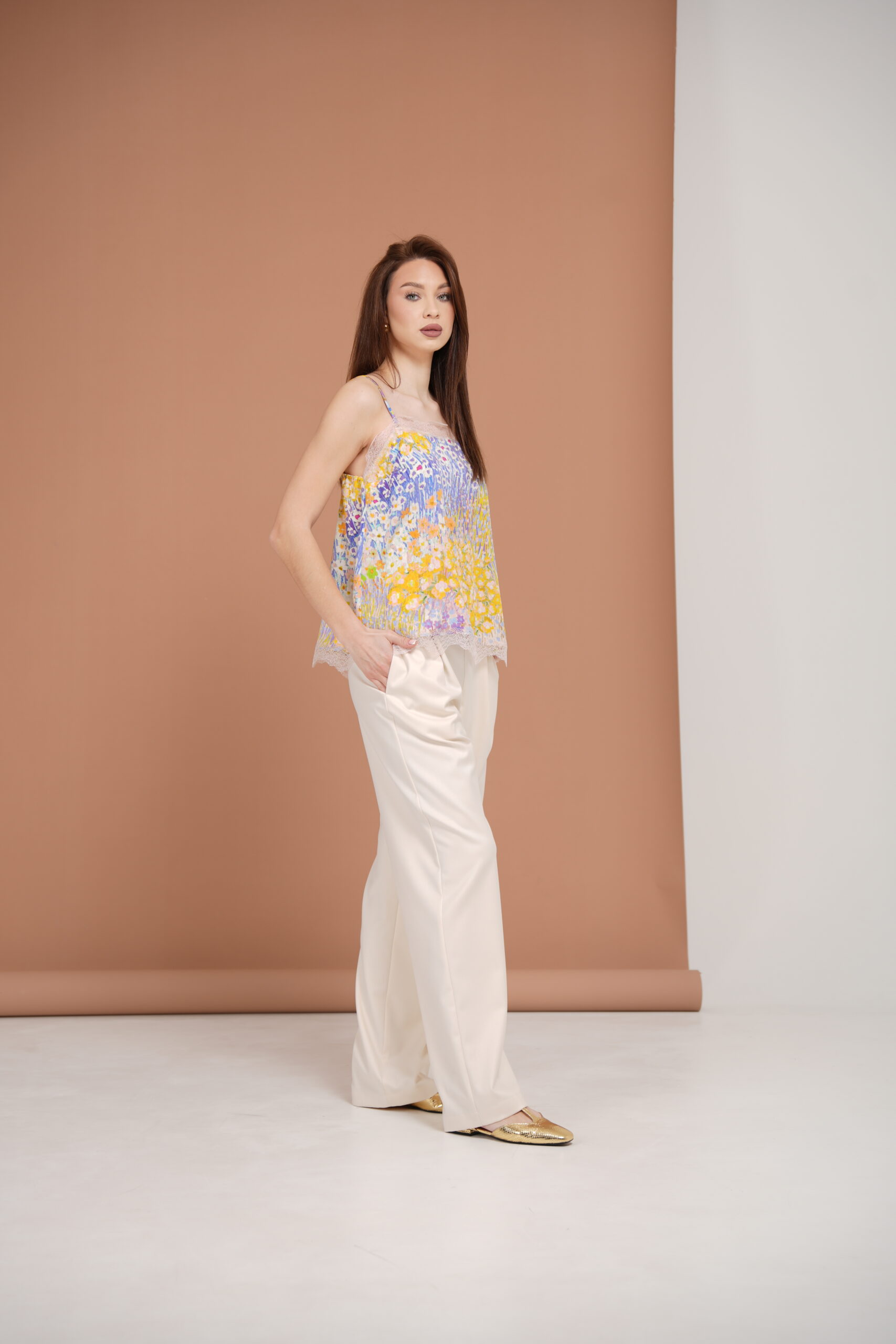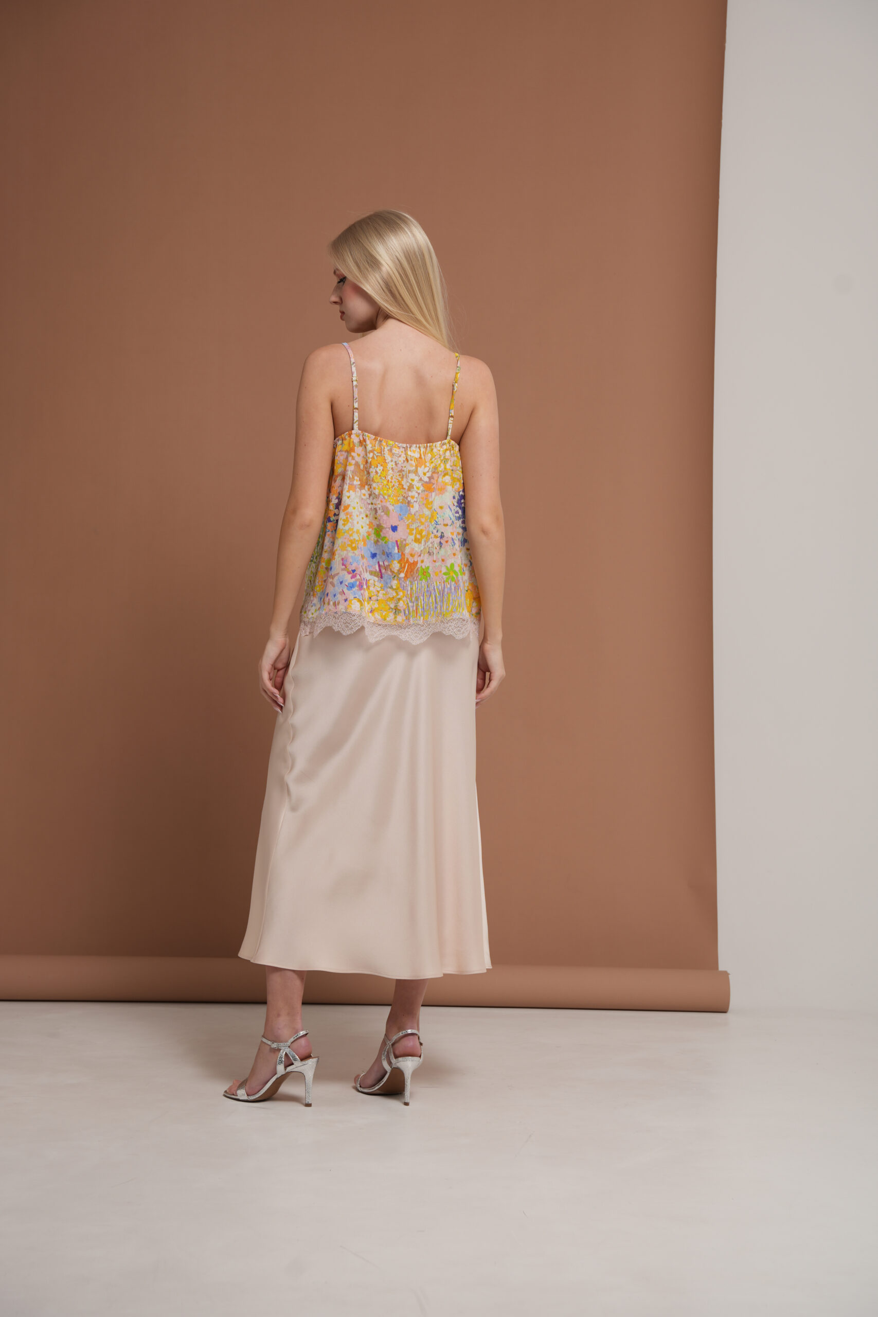 An elegant silk camisole featuring delicate lace detailing along the hem. The lightweight silk drapes beautifully, creating a refined and feminine silhouette. Thin adjustable straps and a V-neckline highlight the shoulders and décolletage.