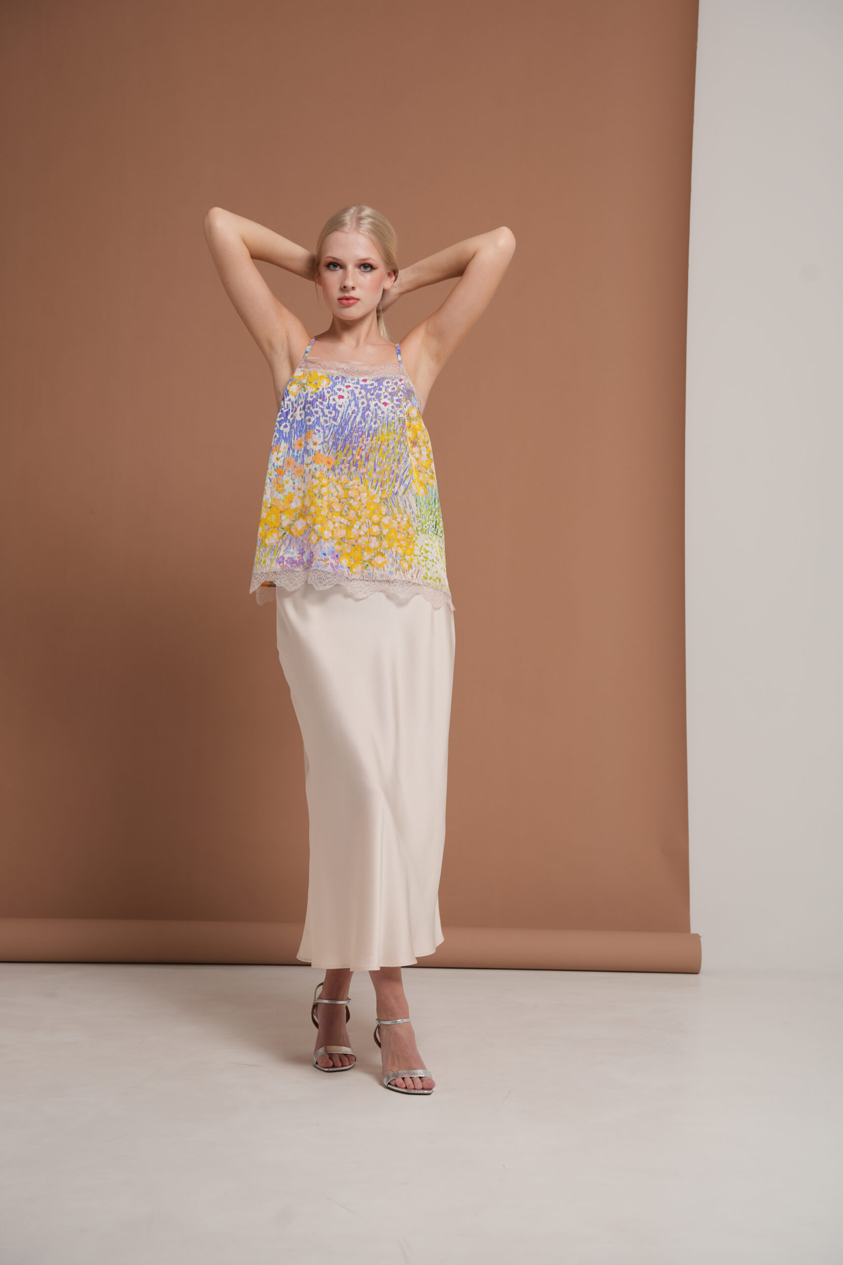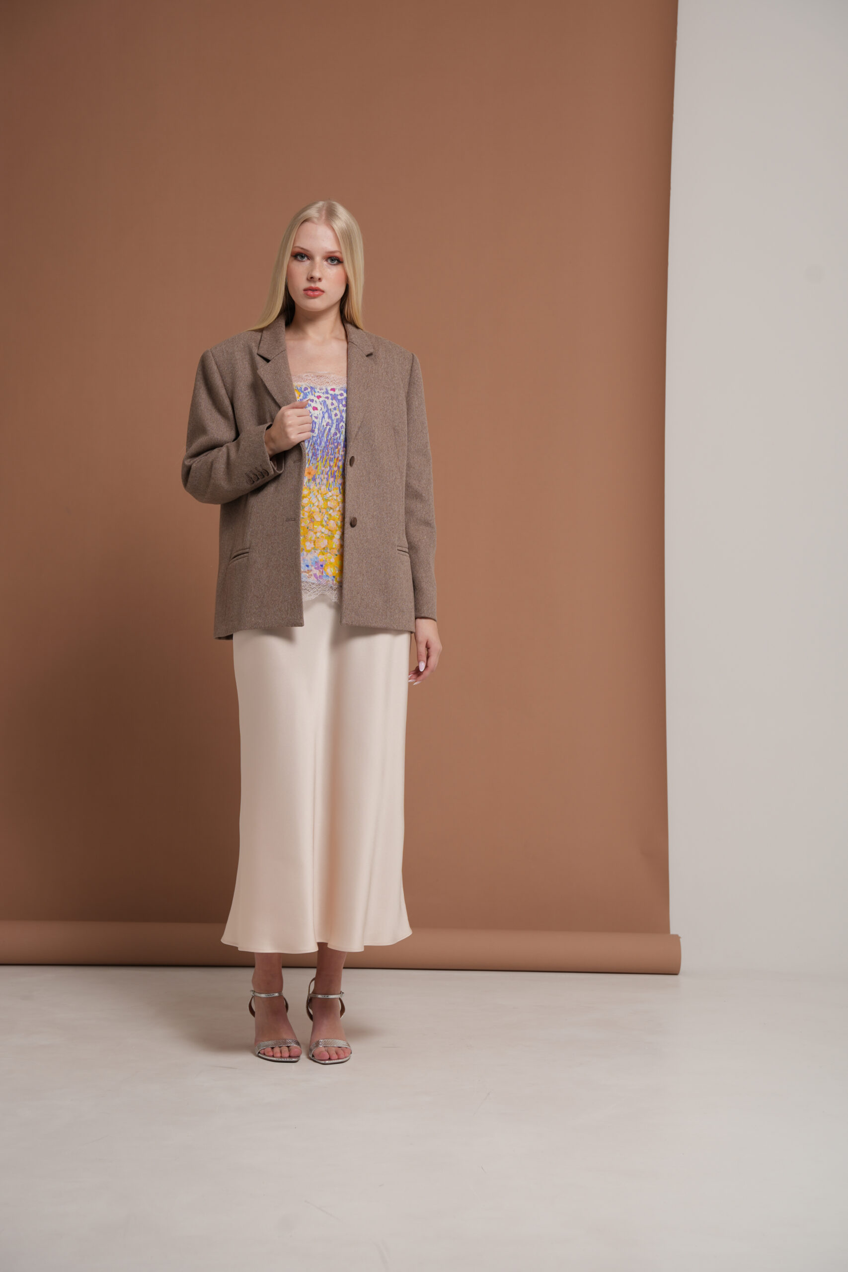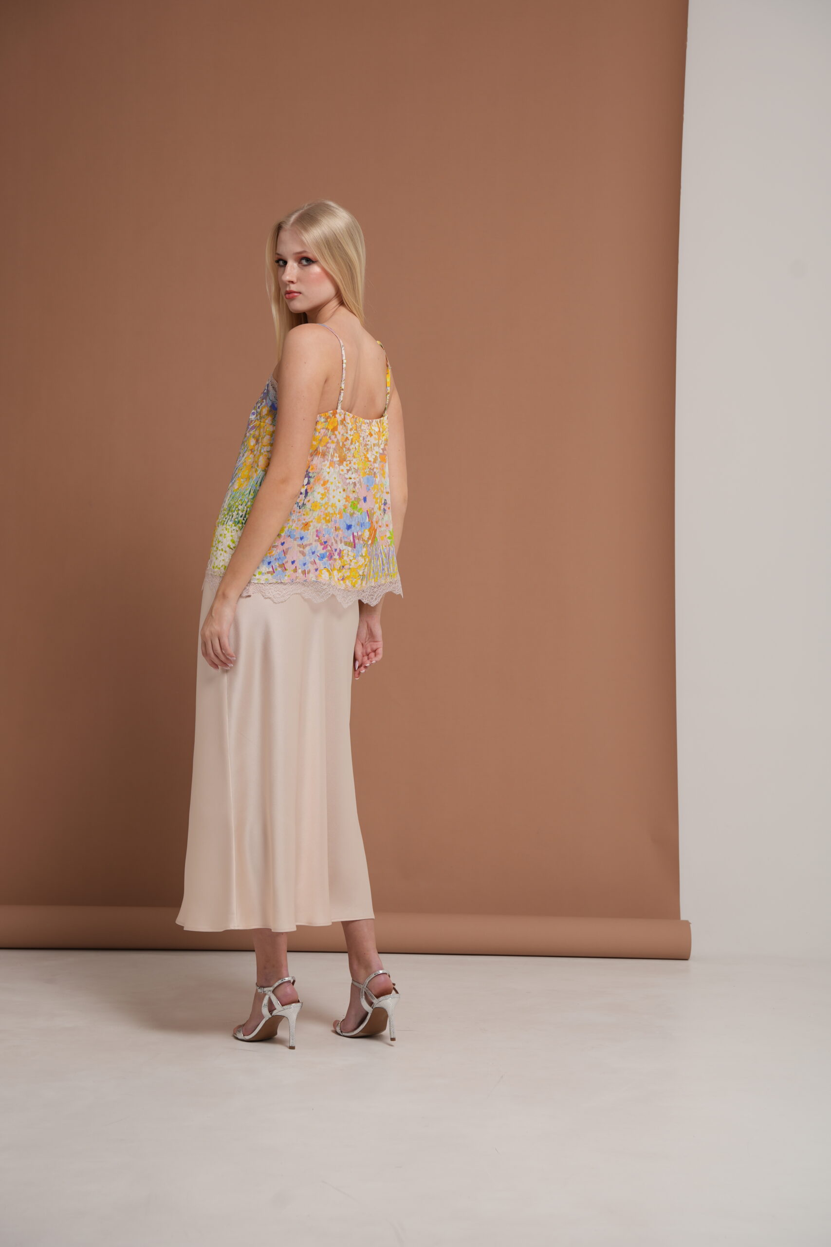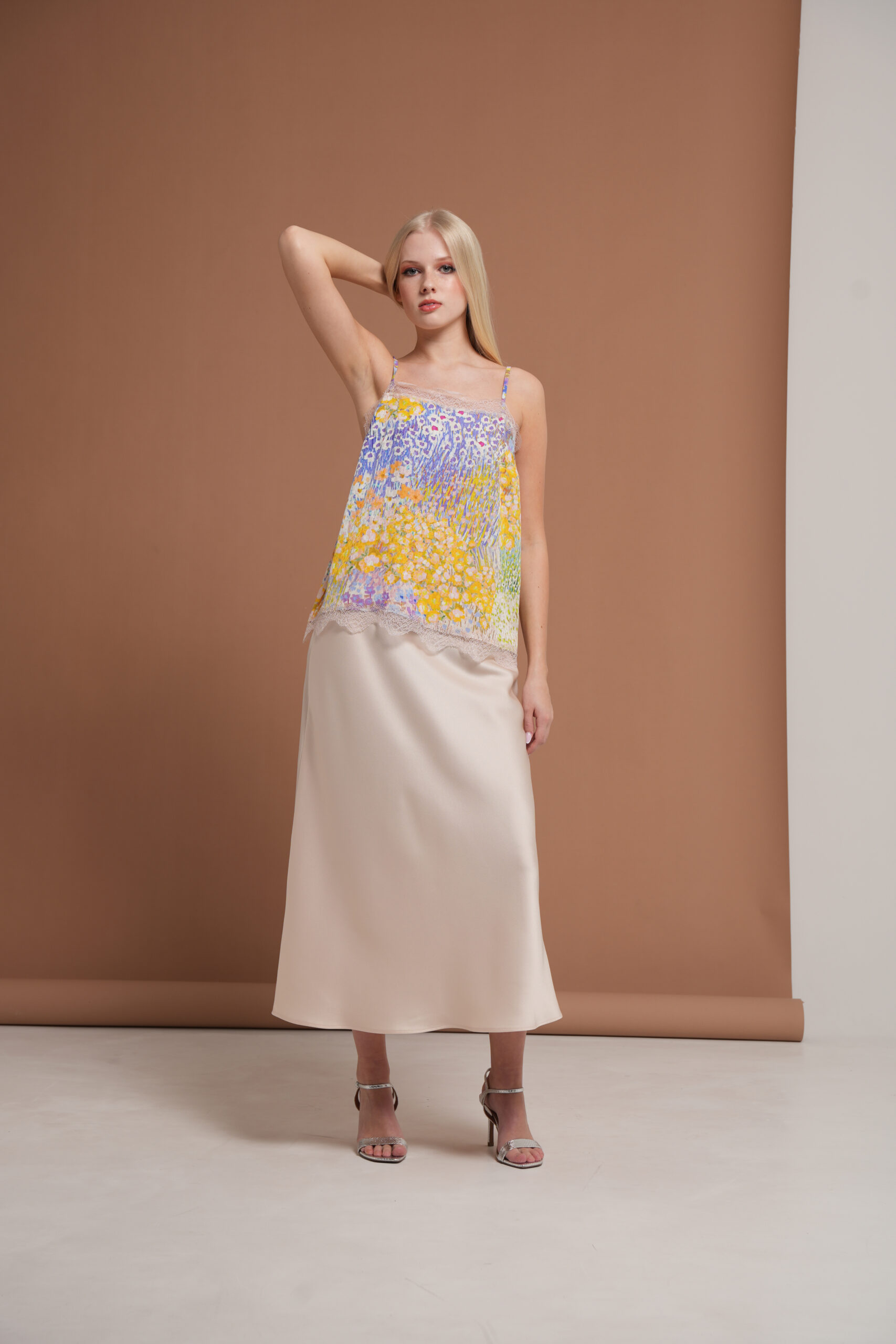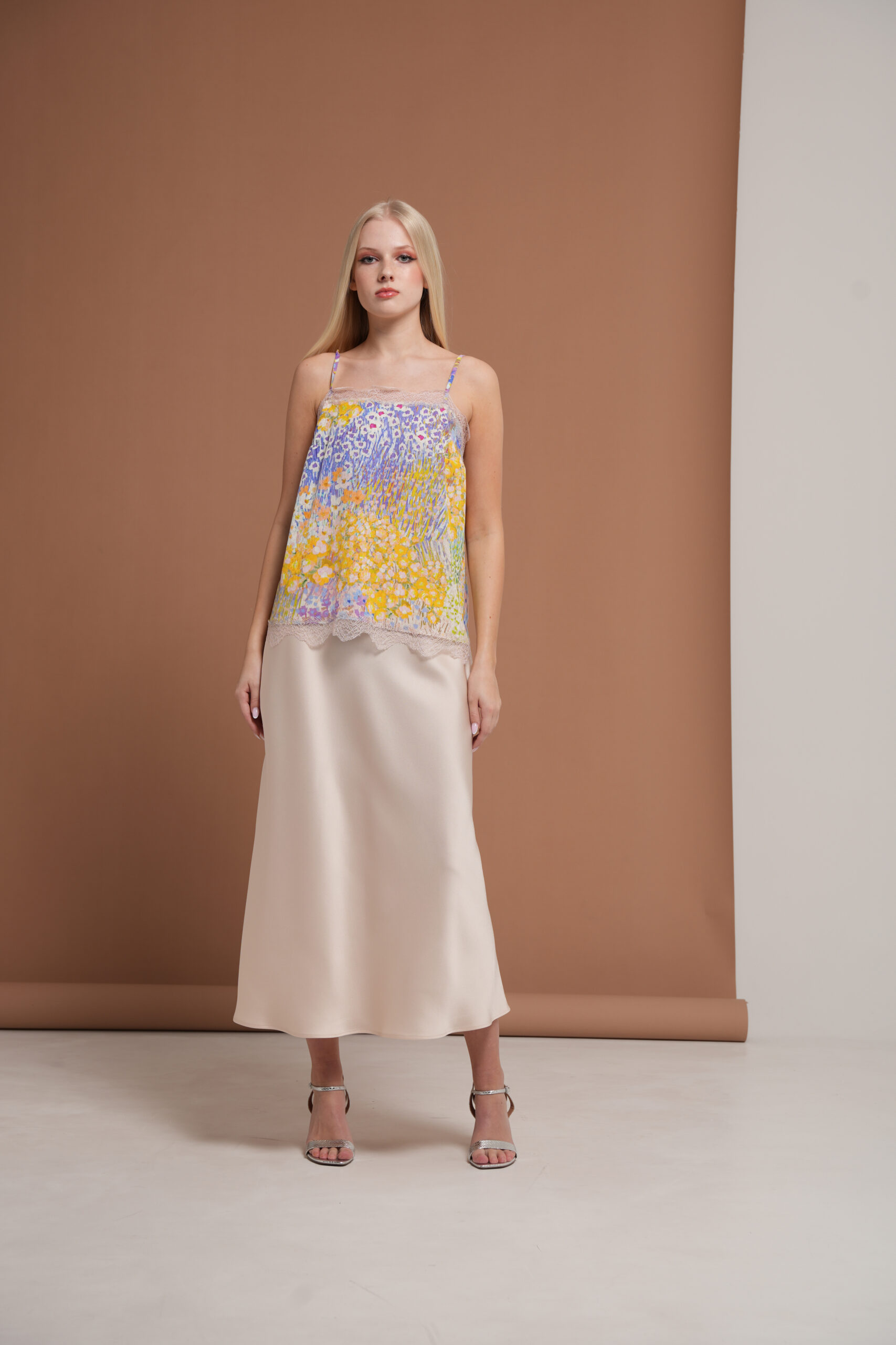 • Midi skirt, includes an elasticated waistband. Тhe skirt is sewn on an oblique.